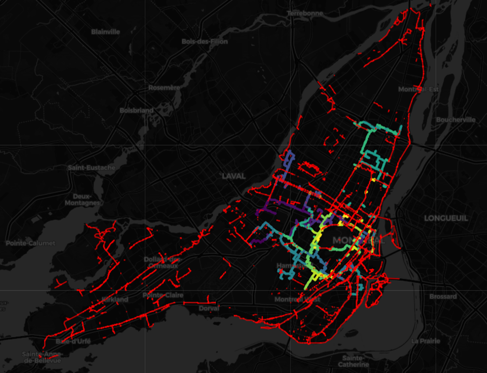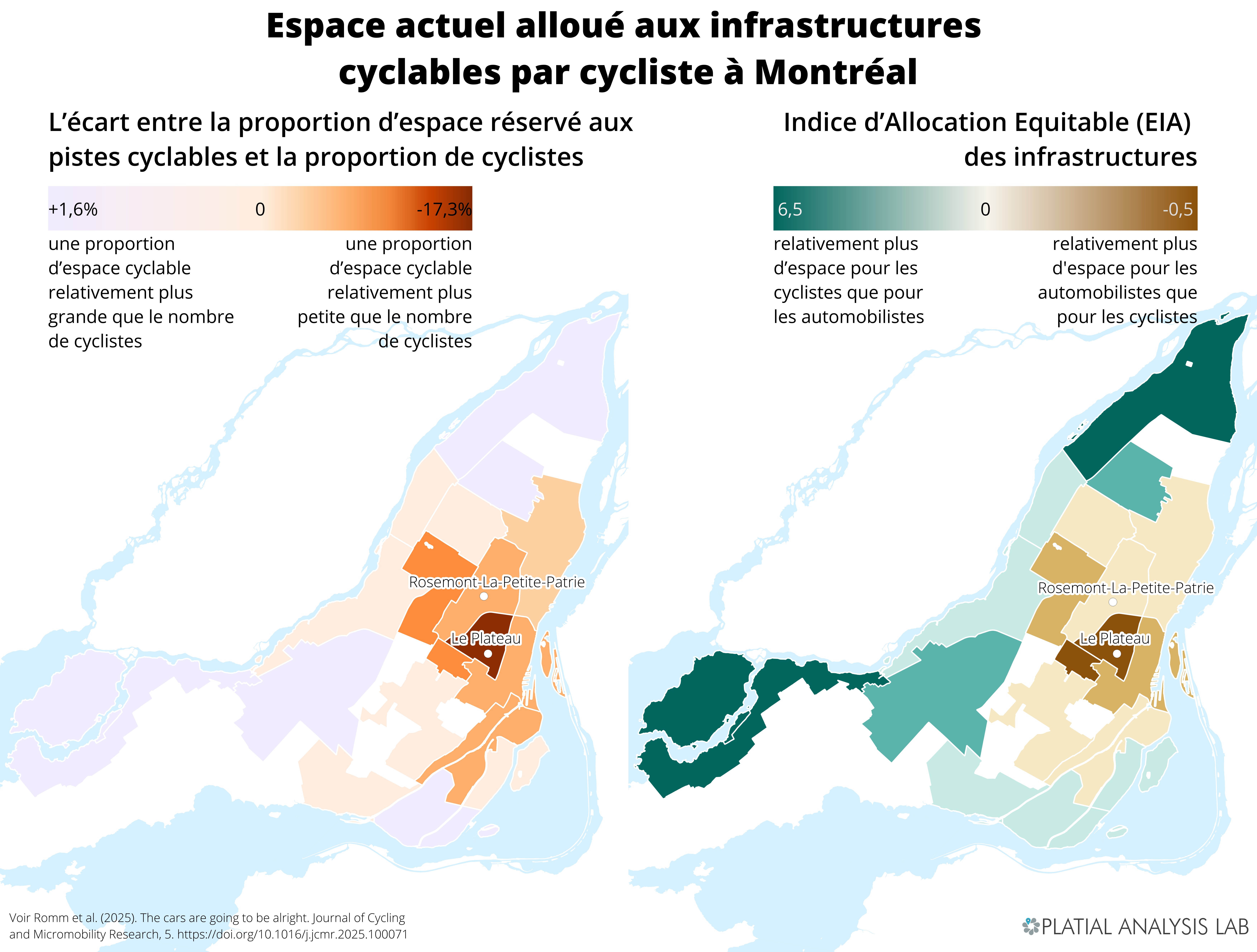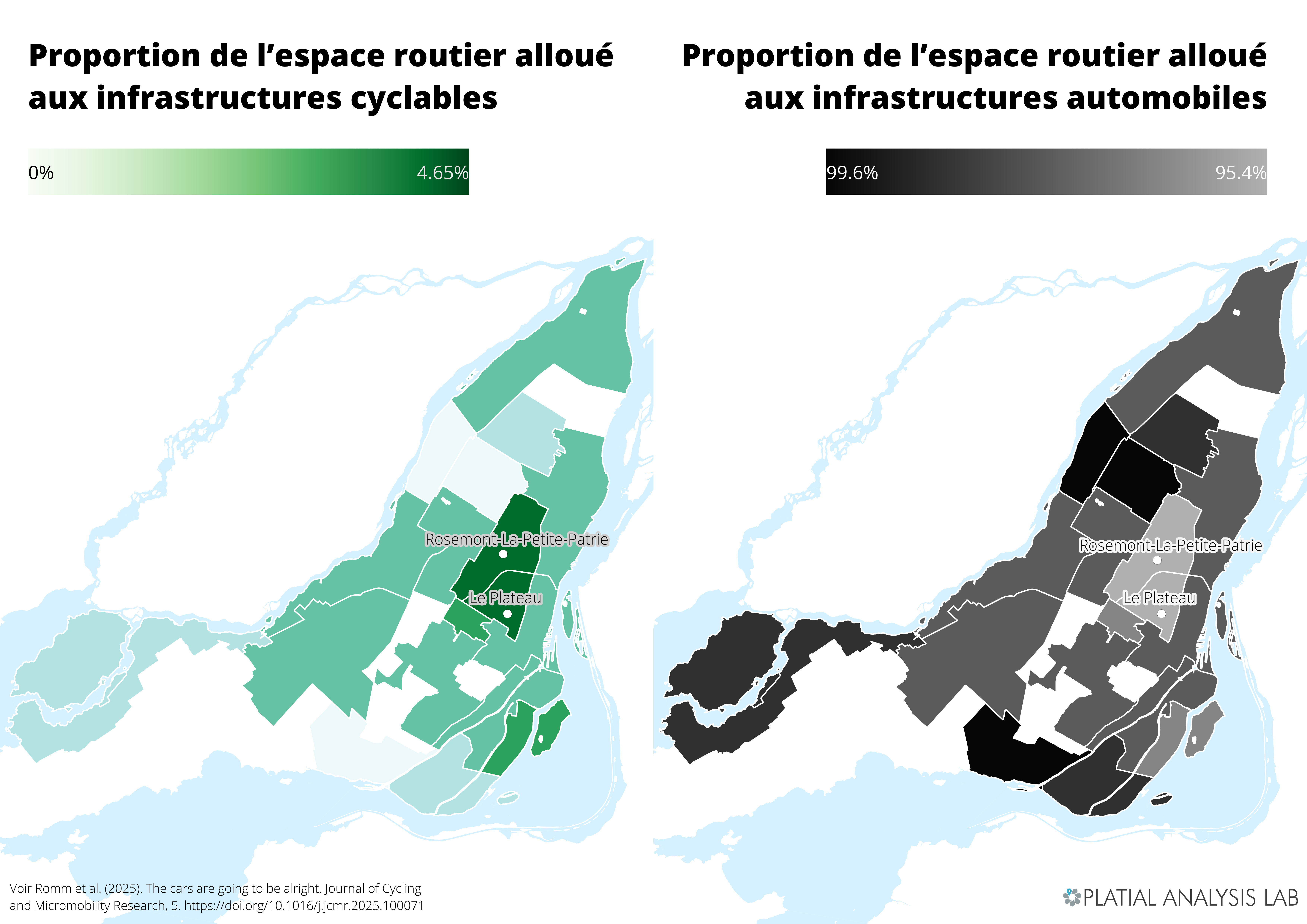 Si l’on ne considère que l’équilibre entre l’infrastructure automobile et l’infrastructure cyclable, le portrait est encore plus sombre : les voitures occupent 97,7 % de la chaussée, tandis que les vélos ne disposent que de 2,3 %. En comparaison, parmi les déplacements effectués avec ces deux modes, 95,1 % se font en voiture et 4,9 % à vélo, révélant un écart de 212 % entre l’usage et l’espace alloué. L’arrondissement qui consacre la plus grande proportion de sa voirie au vélo est Le Plateau–Mont-Royal, avec seulement 4,65 % de l’espace de rue dédié aux infrastructures cyclables. Pourtant, ce sont 21,9 % des déplacements débutant sur Le Plateau–Mont-Royal qui se font à vélo.