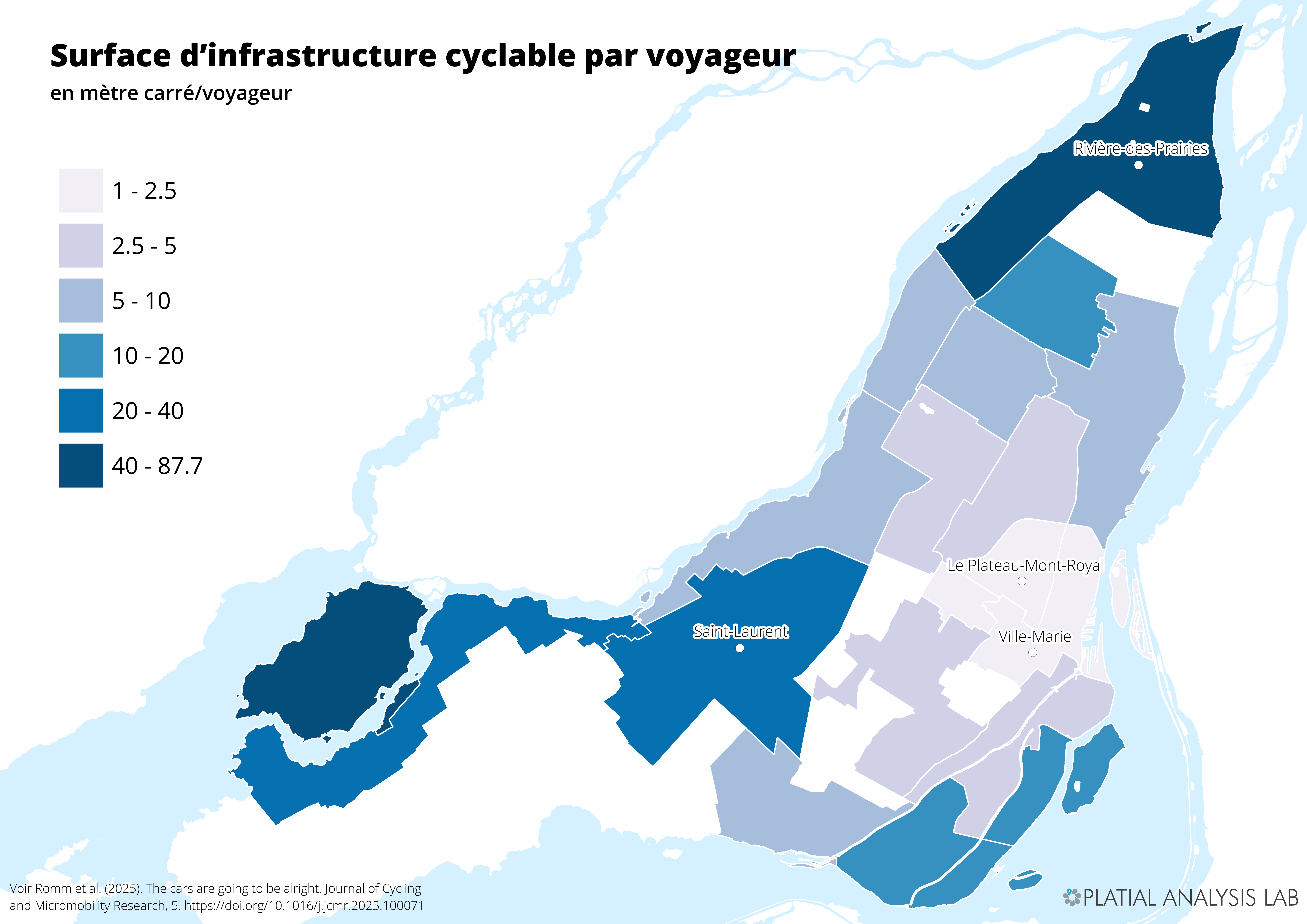 Carte de la surface par voyageur d'infrastructures cyclables à Montréal, par arrondissement - Source : Romm, 2025