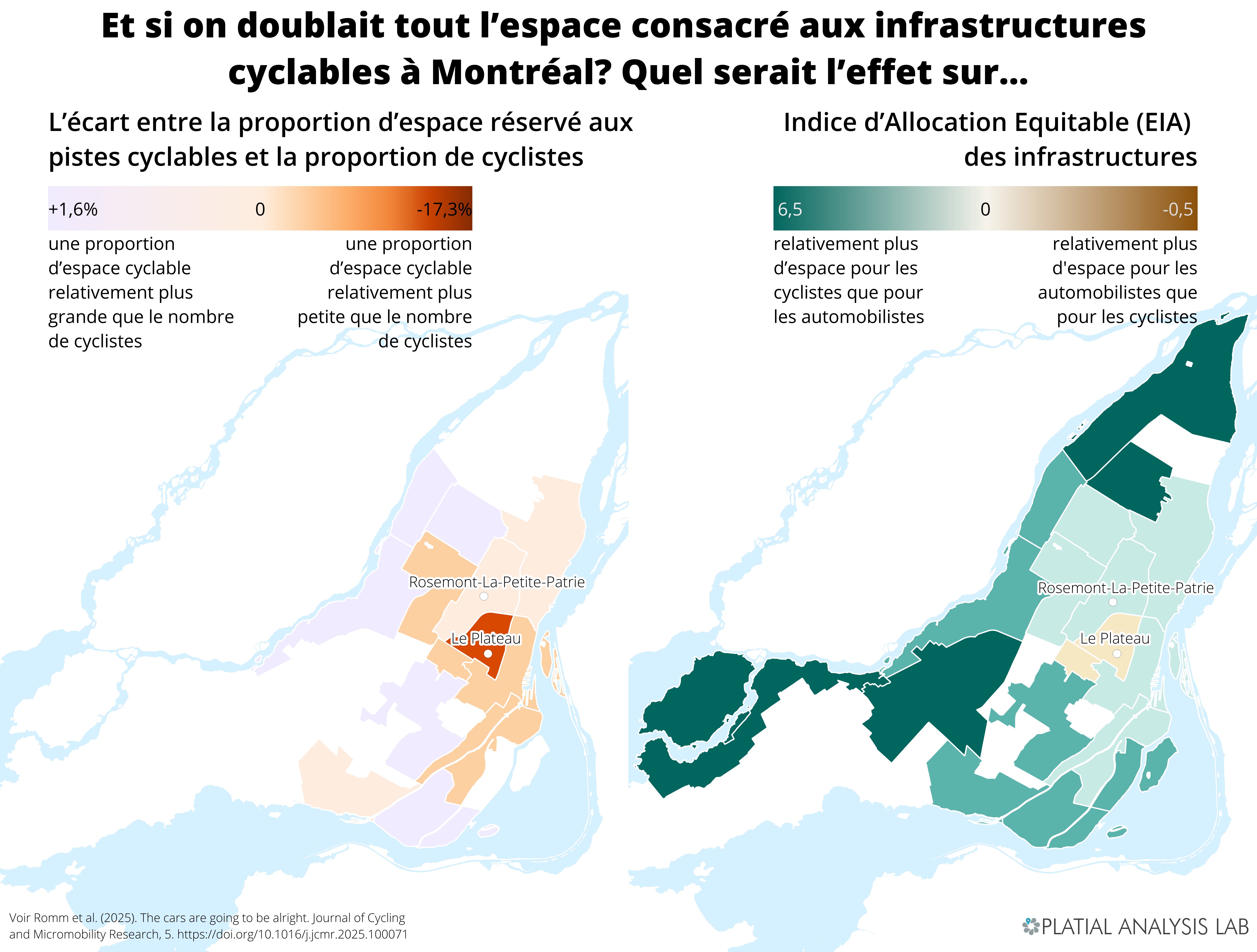 Et si l’on adoptait une approche encore plus radicale en doublant toutes les pistes cyclables de Montréal ? L’espace cyclable augmenterait alors de +4,45 m² par voyageur, tandis que l’espace alloué à l'automobile ne diminuerait que de −0,14 m² par voyageur. Dans Le Plateau–Mont-Royal, les automobilistes ne perdraient que −0,15 m² par personne. Le score EIA s’améliorerait de +0,8, et tous les arrondissements sauf deux afficheraient un indice EIA positif. Même dans ce scénario, la part de l’espace routier consacrée aux voitures ne descendrait jamais sous les 90 %. Ainsi, alors que la situation des cyclistes s’améliorerait considérablement, l’impact sur l’espace automobile par voyageur serait presque imperceptible. Proportionnellement, les voitures continueraient de dominer l'espace routier.